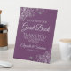 This beautiful wedding tabletop guest book sign is a wonderful welcome for your guests, and will help you direct them to sign your guest book to leave a lasting memory of your special day. It features a simple yet elegant plum purple and silver design with script lettering and lacy faux foil curls and swirls in the corners. The sign reads: Please Sign Our Guestbook Thank You for Celebrating with us! There is room for your names and the wedding date below.