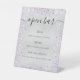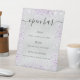 A faux silver loking background decorated with purple, violet faux glitter, sparkles. With the text: Open bar. Personalize and add your bar menu.