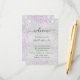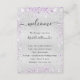 A modern, elegant wedding program, timeline. Faux silver metallic looking background decorated with purple and faux silver glitter dust. Personalize and add your names and wedding details. Black colored letters.