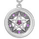 Super cute & witchy, round sterling silver plated charm necklace, with an image of a fancy silver Pentagram with purple accents. Complete with a 18" sterling silver-plated chain (2" extender) and lobster claw clasp, this necklace is finished with a UV resistant and waterproof coating to protect the imagery for years to come. The necklace arrives in a special black felt bag that is perfect for gifting to Witchy Babes who love pentagrams & what they represent to them.