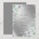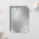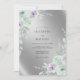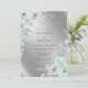 This design features a shimmering silver metallic background that creates a sophisticated and luminous mood. Soft watercolor roses in shades of lavender and lilac are paired with delicate sage green foliage. The ethereal botanical elements offer a graceful and romantic aesthetic perfect for a formal winter or spring event.