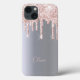 An elegant, girly and glam case. Faux rose gold glitter drip, paint drip. Chic faux silver metallic looking background. Template for your name written with a hand lettered style script. Rose gold colored letters.