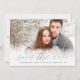 This elegant save the date features shimmering silver script in faux foil with a striped backer. Upload your own photo and customize the information to include your wedding details.