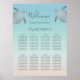 Elegant silver sea turtles on a turquoise sand/beige bakcground. Wedding welcome sign with custom bride and groom names and a seating list for 80 guest´s names.