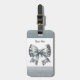 This luggage tag is embellished with a stunning silver bow, sequins, and glitter accents along the top and bottom. Personalize it with your name and information as you wish. The reverse side is also decorated with silver dots for an additional touch of elegance.