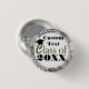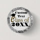 Easily customize these popular round stylish and classy button pins with the year of graduation~shown is 20XX in black stylish font. Room for the graduate's name or the school name, etc. as well. The text color and font can also be easily changed. Cool gold graphic design with "Class Of" is on a 3d look graphic on white background with a sparkling silver sequins, printed, look frame all around. Realistically printed, not real sequins. Added is a matching cute little black graduation cap / hat with gold tassel that sits above the letter C in Class. Lots of sizes of these buttons are available. Great, fun, for the entire graduating class and guests. Perfect for kids, teens, and men and women graduates of any age! Great for preschool and elementary school, junior middle school, high school seniors, or college seniors and graduate school seniors as well!