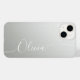 Silver Shimmer White Elegant Calligraphy Script Custom Personalized Name iPhone 14 Smart Phone Cases features a modern and trendy simple and stylish design with your personalized name in elegant hand written calligraphy script typography on a metallic silver shimmer background. Designed by ©Evco Studio www.zazzle.com/store/evcostudio