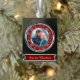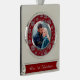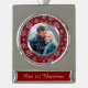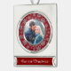 This Christmas keepsake ornament features your photograph within a frame of silver faux glitter snowflakes on a Christmas burgundy red background. The snowflake pattern frame has an inside faux silver lining. The bottom portion has your custom text in silver on a matching red background. A pretty keepsake gift for any couple. *Please note - the inside image is printed and contains no actual glitter.*