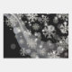 Winter themed wrapping paper sheet design featuring faux silver snowflakes, sparkles and lights on a black background.