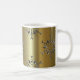 An elegant Christmas coffee mug featuring a festive pattern of large silver snowflake stars scattered over a metallic gold background, to add a touch of color and class to your holidays this year.