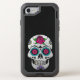 Black iPhone X Otterbox brand case with graphics of a silver sugar skull with colorful flowers. Customize this case to add your own text. Chose the device you want before ordering.