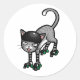Featuring an cartoon silver tabby wearing 2 pairs of roller-skates, black and white stripey socks and a safety helmet.