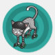 Featuring an cartoon silver tabby wearing 2 pairs of roller-skates, black and white stripey socks and a safety helmet.