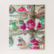 This custom puzzle features a silver tinsel tree decorated with vintage Christmas ornaments. The silver branches are loaded with Shiny Brites and other pink, green, silver and aqua vintage ornaments.