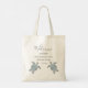 This modern welcome bags for beach wedding features silver turtles and tropical leaves on an abstract gradient in sand beige and ocean aqua blue.