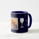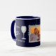 A silver frame at the middle shows off your favorite photographs on this elegant Silver Wedding Anniversary keepsake mug. It's easy to upload your own photograph. On each side of the photograph is a silver long stemmed wine glass image, and your custom text. Everything is placed on a deep navy blue background. A nice keepsake gift for that special couple.