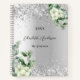 Faux silver looking background decorated with white florals, flowers, eucalyptus greenery and faux silver glitter, sparkles. Personalize and a year, name and a title/text