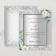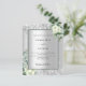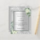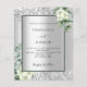 Faux silver looking background decorated with white florals, flowers, eucalyptus greenery and faux silver glitter, sparkles. Personalize and add your names and wedding details. Black letters.