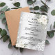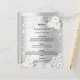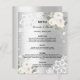 A faux silver looking background decorated with white florals, roses, diamonds and white lace. Personalize and add your names and the menu.