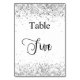 The table number is written with an elegant hand lettered style script. Black letters, a white background on front and faux silver background with faux glitter dust, sparkles on the back.
