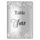 The table number is written with an elegant hand lettered style script. Black letters, a white background on front and faux silver background with faux glitter dust, sparkles on the back.