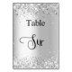 The table number is written with an elegant hand lettered style script. Black letters, a white background on front and faux silver background with faux glitter dust, sparkles on the back.