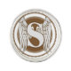 Brown, round doily with white and brown border which has a white lattice trim. Large silver wings left and right of initial. Template monogram for you to customize.