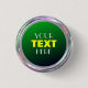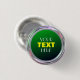 Chrome plated metal button for text, logo or image. Green-black circle. Template with three text fields.