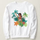 This vibrant illustration introduces Simea, Moana's younger sister, from the animated world of Moana. Simea stands with a bright, adventurous smile, exuding youthful enthusiasm and curiosity. Dressed in a beautifully patterned orange and white outfit that reflects traditional Polynesian designs, she is surrounded by lush tropical flora, a starfish, and the iconic palm trees of their island home. Her playful and explorative spirit is captured perfectly in this image, highlighting her connection to the natural world and her emerging role as a young navigator. This graphic beautifully encapsulates Simea's charm and her potential to follow in Moana's footsteps as a beloved character in her own right.