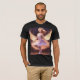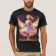 "For a minimalist yet elegant design, a beautiful angel is depicted in a subtle white outline on a black t-shirt. The angel's wings are translucent with a slight sheen, giving off a vintage, dreamy look. The angel is in a relaxed pose with her hands slightly raised, as if floating in the wind. Her long wavy hair seems to be blowing in the light breeze, and her expression is calm and peaceful, which looks both casual and stylish."