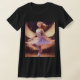 "For a minimalist yet elegant design, a beautiful angel is depicted in a subtle white outline on a black t-shirt. The angel's wings are translucent with a slight sheen, giving off a vintage, dreamy look. The angel is in a relaxed pose with her hands slightly raised, as if floating in the wind. Her long wavy hair seems to be blowing in the light breeze, and her expression is calm and peaceful, which looks both casual and stylish."