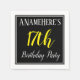 This simple and elegant paper napkin design features a message like "ANameHere’s 17th Birthday Party", with the "17th" in fancy yellow-colored text, within a black-colored square area featuring a simple border outline. A personalized name can be used. Napkins like these could perhaps be used at a birthday party for somebody who is celebrating their seventeenth birthday. [~Z0000150]