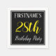 This simple and elegant paper napkin design features a message like "FirstName’s 28th Birthday Party", with the "28th" in fancy yellow-colored text, within a black-colored square area featuring a simple border outline. The name can be customized. Napkins like these could perhaps be used at a birthday party for somebody who is celebrating their twenty eighth birthday. [~Z0000150]
