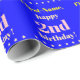 This simple birthday wrapping paper design features a message like "First-Name, happy 2nd birthday!", where the name and birthday number can be customized. It also features decorative star shapes. The background is colored blue. Wrapping paper like this could perhaps be used to wrap presents being given to celebrate somebody’s birthday. [~Z0000243]