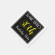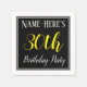 This simple and elegant paper napkin design features a message like "Name-Here’s 30th Birthday Party", with the "30th" in fancy yellow-colored text, within a black-colored square area featuring a simple border outline. The name can be customized. Napkins like these could perhaps be used at a birthday party for somebody who is celebrating their thirtieth birthday. [~Z0000150]