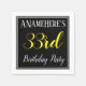 This simple and elegant paper napkin design features a message like "ANameHere’s 33rd Birthday Party", with the "33rd" in fancy yellow-colored text, within a black-colored square area featuring a simple border outline. A personalized name can be used. Napkins like these could perhaps be used at a birthday party for somebody who is celebrating their thirty third birthday. [~Z0000150]