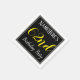 This simple and elegant paper napkin design features a message like "NameHere’s 62nd Birthday Party", with the "62nd" in fancy yellow-colored text, within a black-colored square area featuring a simple border outline. A custom name can be used. Napkins like these could perhaps be used at a birthday party for somebody who is celebrating their sixty second birthday. [~Z0000150]