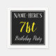This simple and elegant paper napkin design features a message like "Name-Here’s 71st Birthday Party", with the "71st" in fancy yellow-colored text, within a black-colored square area featuring a simple border outline. The name can be customized. Napkins like these could perhaps be used at a birthday party for somebody who is celebrating their seventy first birthday. [~Z0000150]