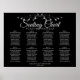 This 8 table seating chart will make it easy for your guests to find their seats at your wedding reception. Features a simple elegant design of pale silver gray text with a black background and a silver vintage floral filigree border. Has seating assignments for 80 guests.