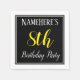 This simple and elegant paper napkin design features a message like "NameHere’s 8th Birthday Party", with the "8th" in fancy yellow-colored text, within a black-colored square area featuring a simple border outline. A custom name can be used. Napkins like these could perhaps be used at a birthday party for somebody who is celebrating their eighth birthday. [~Z0000150]