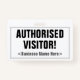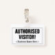 This simple badge design features the message "AUTHORISED VISITOR!", and a customizable company name or other custom message. It also features a triple-line border. A badge like this could be used to indicate that a visitor or guest at a workplace is allowed to be there. [~Z0000307]