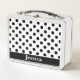 This metal lunch box has a black and white polka dot pattern. Personalize the lunch box by adding the recipient's name.