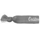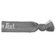 This black hair tie has text in a white script. The text can be edited or deleted.