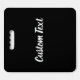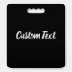 This black seat cushion has text in white script. Text can be edited or deleted.