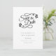 This simple black and white save the date card features a pretty script save the date with a leaf motif, set above your details in an elegant modern text.