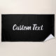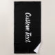 This black beach towel has a white script as its display text. You can edit it to show personalized text.