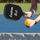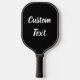 This black pickleball paddle has display text in a white script. The text can be edited or deleted.