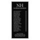 Modern business rack cards featuring a simple and minimal black design with your monogram in a bold font along with your name at the top. Below is your price list / service menu and your contact info.