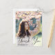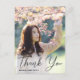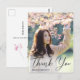 Send an elegant custom photo thank you card to your family and friends for your graduation. This modern design template features your photo with an overly in hand lettered black script that reads, "Thank You" with your name below. The back of the postcard has a thank you message you may personalize accented by watercolor pink cherry blossoms. Designed by artist ©Susan Coffey.