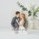 Thank your wedding guests in style with this elegant custom photo thank you postcard. This typography design template features your picture on the front with an overlay and the words "Thank You" in black script and your names and wedding date to personalize. The back of the postcard has a custom message and signature on a white background. Designed by artist Susan Coffey.